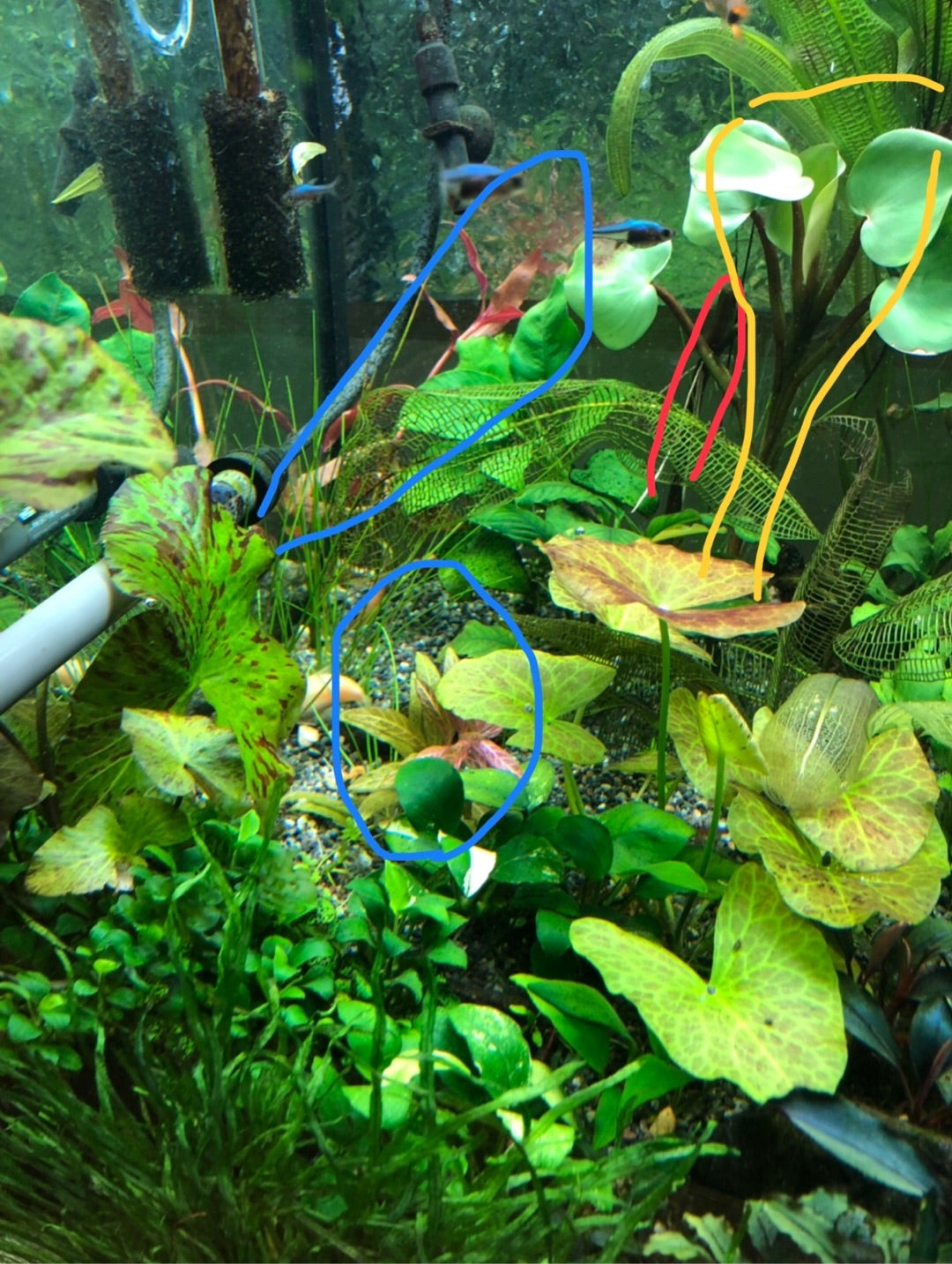 ・ジャックと豆の木こと、エイクホルニア sp.パンタナールは、大胆にぶった切って、赤囲みから水中葉を出させる試み@Rootsさん指南。